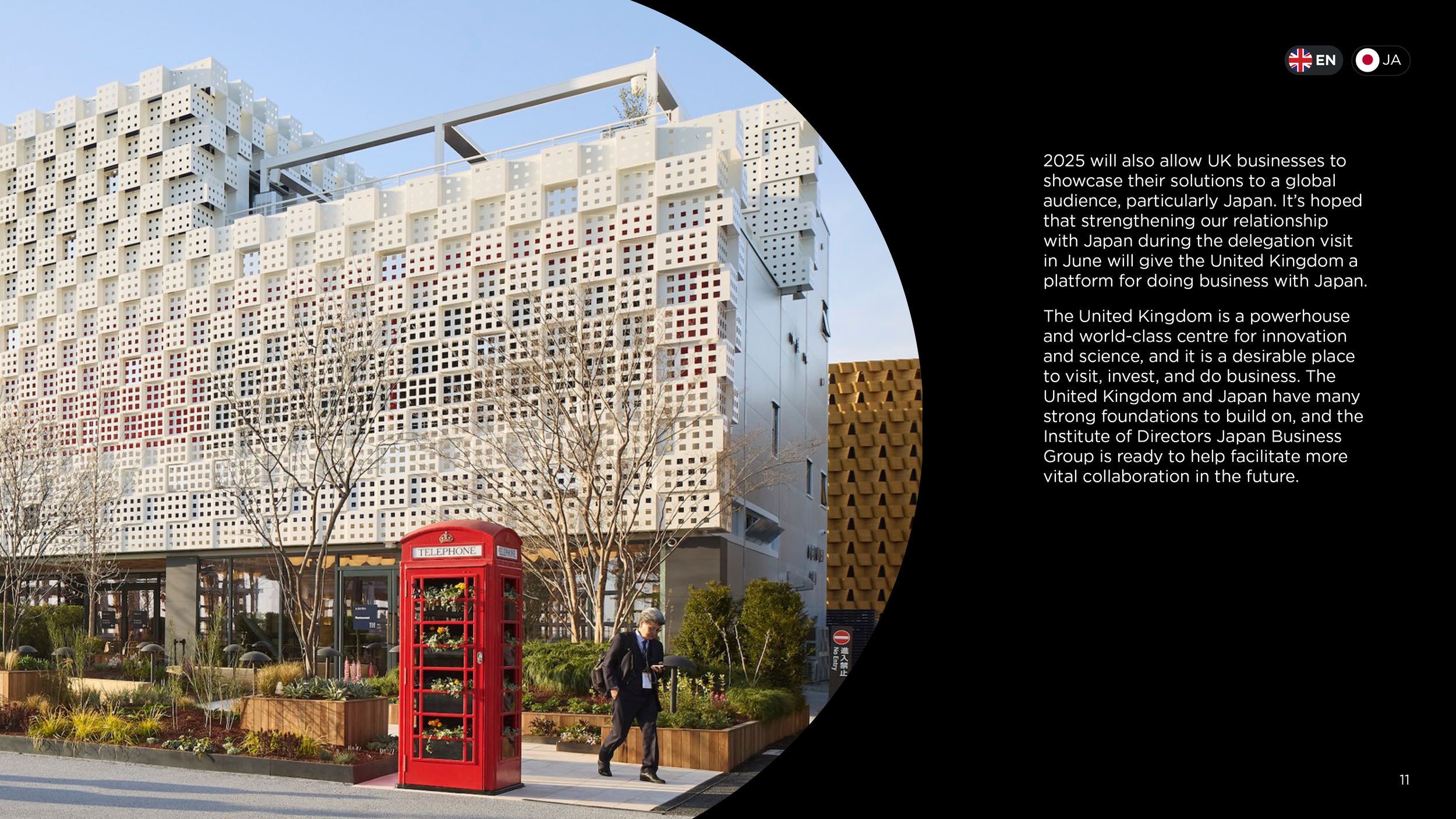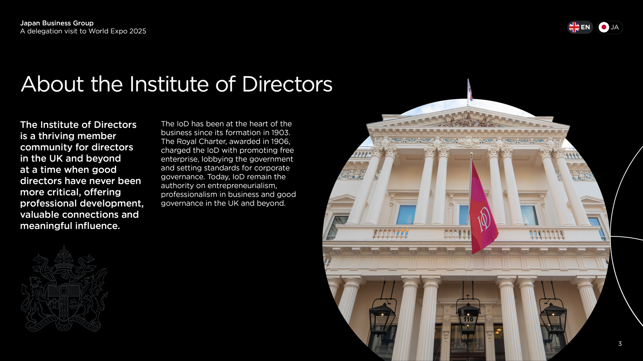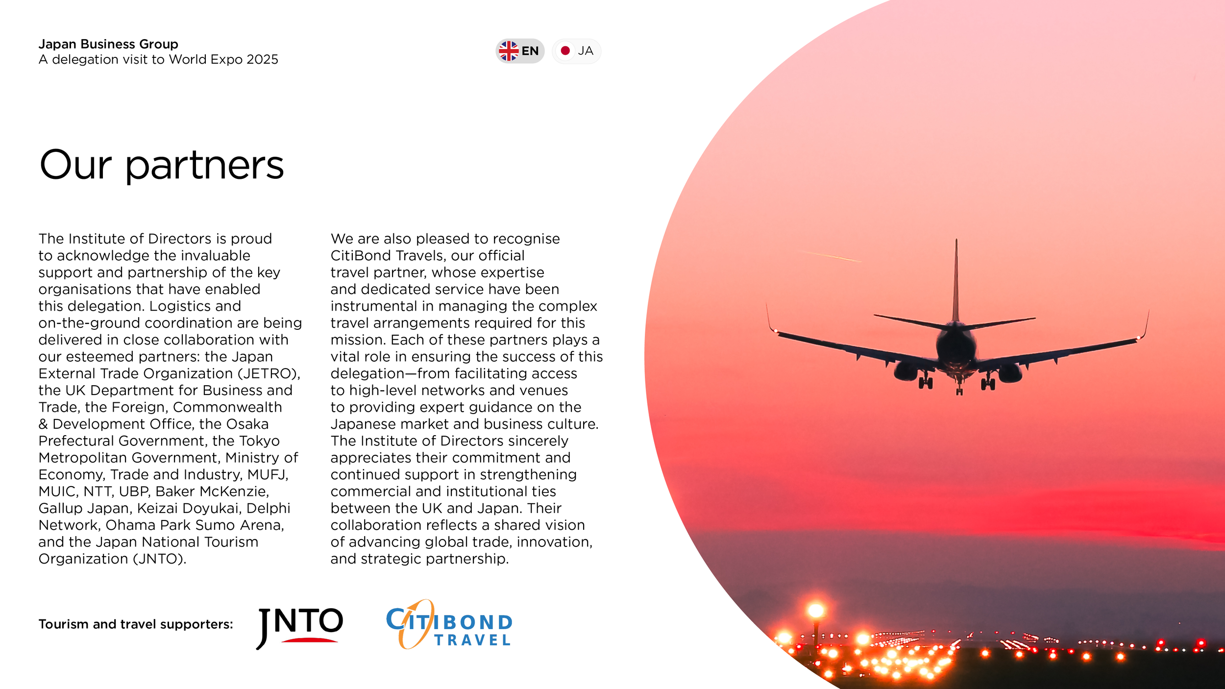 From 7–11 July 2025, the Institute of Directors (IoD) Japan Business Group led the City of London’s sole trade delegation to the Osaka Expo 2025, aiming to strengthen UK–Japan business relations and explore new opportunities. This high-profile delegation brought together senior business leaders for a strategic programme of events and networking.