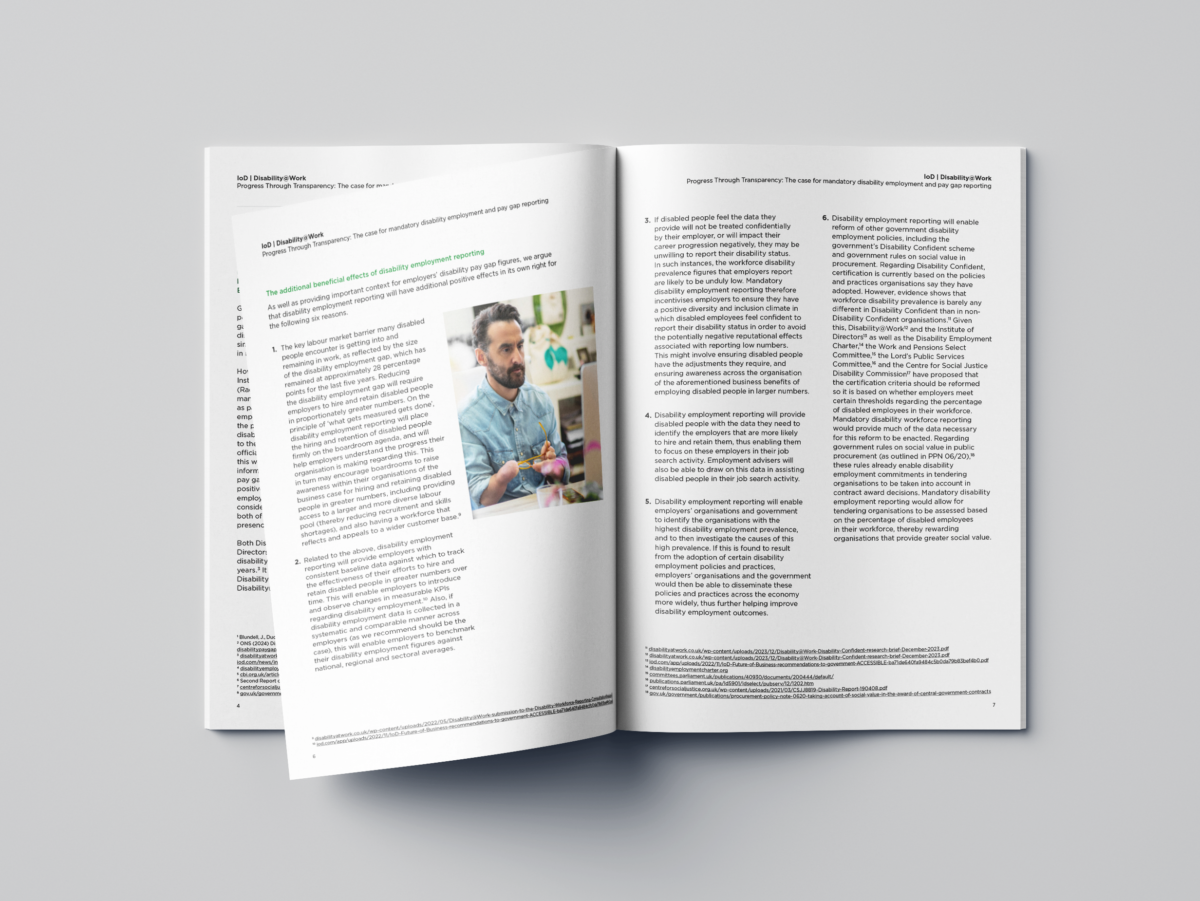 I was responsible for designing both the print-ready and digital versions of the Progress Through Transparency report, ensuring that each format met its specific requirements. The print version was prepared for the Parliamentary launch at the House of Lords, with careful attention to professional presentation and high-quality production. The digital version was designed to meet accessibility standards, ensuring that the report could be read and navigated easily by all audiences. Throughout the process, I collaborated closely with the IoD policy team and Disability@Work team to maintain clarity, readability, and visual consistency across both formats.